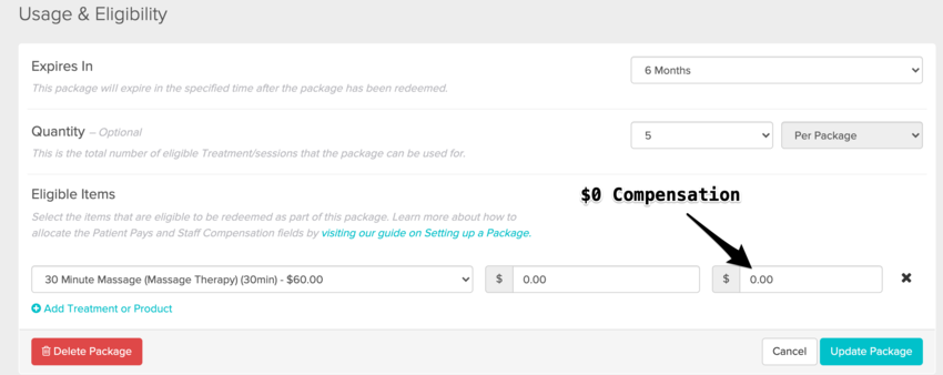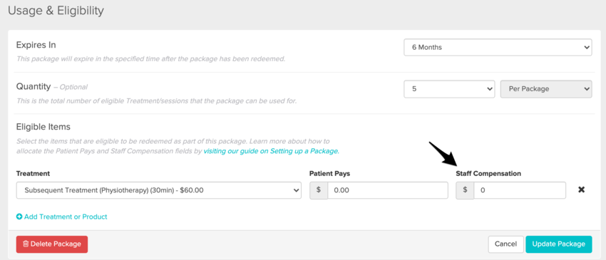 In the example below, we’ve set our package so that every time a patient redeems a package use for a 30 minute Subsequent Treatment, our staff’s compensation will be based off of a $0 rate.