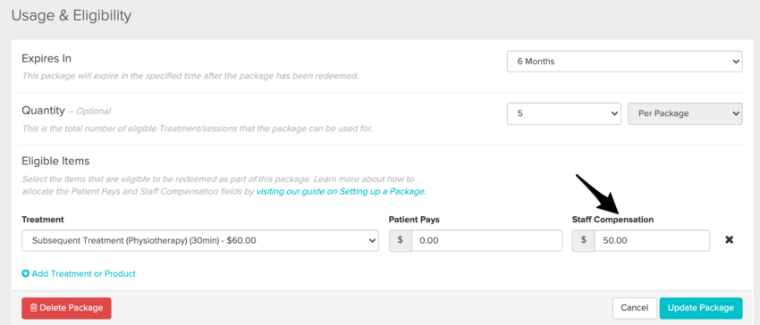In the example below, we’ve set our package so that every time a patient redeems a package use for a 30 minute Subsequent Treatment, our staff’s compensation will be based off of a $50 rate.