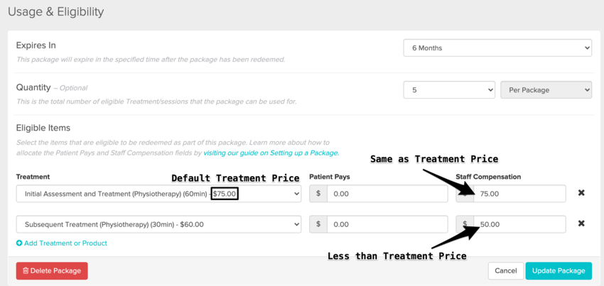 Packages are unique in that the amount that the patient pays per session may not necessarily equate to the the compensation provided to the staff for that session.